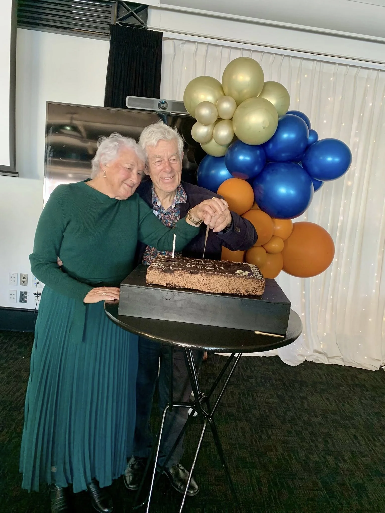 Richard and Robyn Northey cutting the cake at Richard’s 80th